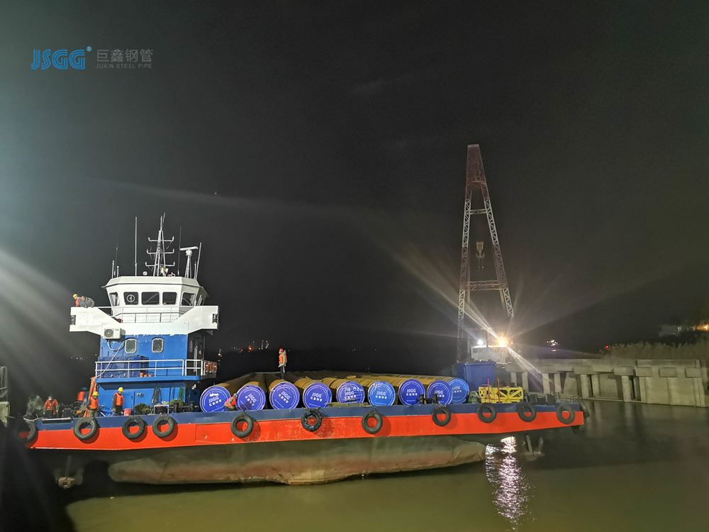 中交四航局三公司南通港呂四港區(qū)項(xiàng)目鋼管樁在巨鑫海工碼頭發(fā)運(yùn)現(xiàn)場(chǎng)