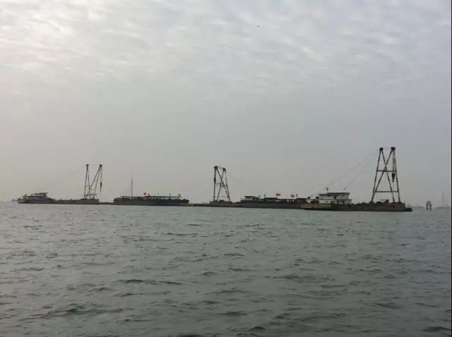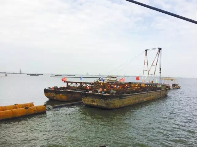 據(jù)介紹,該項目沉管施工全長684米,主要由六節(jié)單根長228米直徑2.62米的鋼管組成,單根重達(dá)410多噸,具有超大、超長、超重等特點,且施工在水下23米深水區(qū)安裝,施工安全風(fēng)險很高,水上作業(yè)難度極大,工程施工要求精準(zhǔn)。為確保沉管施工順利開展,中鐵上海工程局項目部編制了水下大型沉管安裝專項施工方案,引進3臺150噸大型浮吊船、項目部自行研制2艘200噸門吊船、浮力30噸鋼制浮筒8個,共同承擔(dān)水下沉管施工的安裝工作。