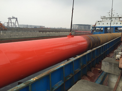 江蘇巨鑫石油鋼管有限公司承接了此項目的鋼管樁生產(chǎn)訂單3300噸,規(guī)格為:φ2200×20/30×80000mm,材質(zhì)為Q345B。其特點(diǎn)為:該鋼管樁由三段鋼管焊接而成。樁頂段鋼管為φ2200×30×15500mm直縫埋弧焊管,中間段為φ2200×22×63000mm為螺旋縫埋弧焊管,樁底段為φ2200×30×1500mm直縫埋弧焊管。另外,樁頂部位還需要焊接一個φ(2140-1540)×30mm圓環(huán)加強(qiáng)板和兩塊2102×1080×30mm加強(qiáng)板,焊接工作量非常大,交貨期非常緊,又加上中國傳統(tǒng)節(jié)日春節(jié),全公司上下聯(lián)動,干部員工放棄休假,全部在生產(chǎn)一線加班加點(diǎn),最終按時保質(zhì)保量完成了生產(chǎn)任務(wù),確保大橋項目的順利打樁。