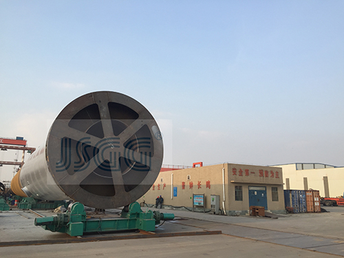 這是巨鑫鋼管承接的魯能集團(tuán)江蘇東臺(tái)200MW海上風(fēng)電單樁項(xiàng)目,該單樁規(guī)格為φ(5500~5900)×(50~70)×62000mm,材質(zhì)為DH36-Z25、DH36、Q345C。其特點(diǎn)為:該鋼管樁由五種不同的厚度,三種不同材質(zhì)組成,樁頂段9米為φ5500×60mm直管與法蘭的焊接件,中間段9米為φ(5500~5900)×60mm 變徑管,樁底段44米為 φ5900×(50~70)mm 直管,焊接工作量非常大。另外,鋼管樁樁頂部位內(nèi)、外表面需要防腐,防腐總長(zhǎng)度24米。其中,鋼管樁外防腐涂層厚度A區(qū)16米為1060μm,B區(qū)8米為600μm;鋼管樁內(nèi)防腐涂層厚度為400μm。由于防腐涂層厚度較大,加之天氣溫度較低,防腐固化時(shí)間較長(zhǎng),防腐工作量非常大。