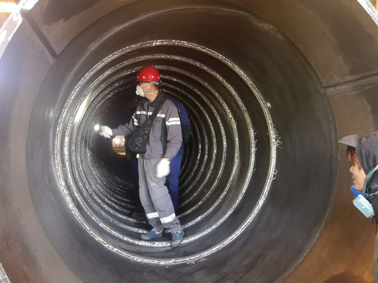 圖三 質(zhì)檢班員工在給東帝汶項目鋼管做超聲波檢測